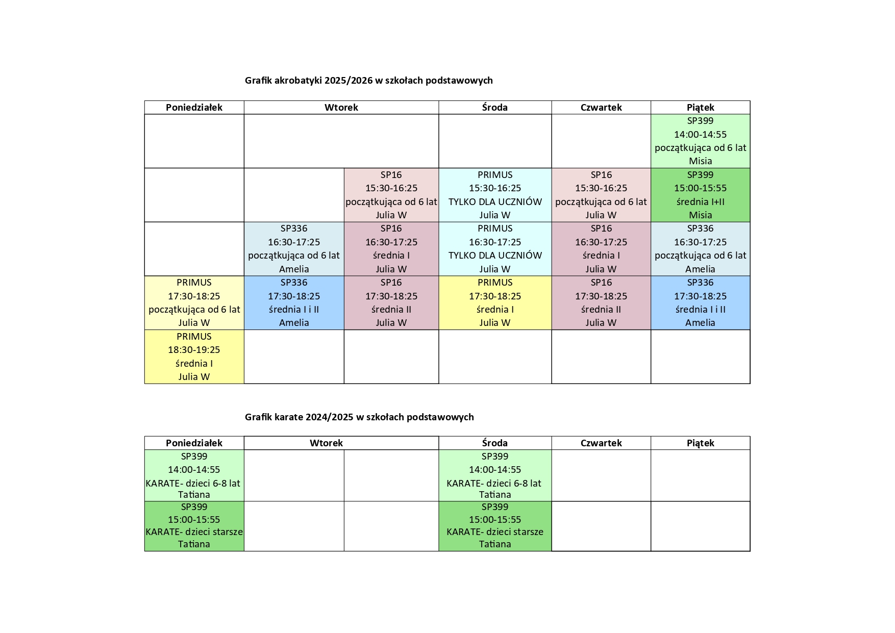Grafik na sezon 2025/2026 Grafik obowiązuje od 01.02.2026. Grafik może ulec zmianie. Grafik AcroSpace Mała sala (I piętro) Grafik AcroSpace Duża sala (parter) Grafik Szkoły SP16, SP336, SP399, PRIMUS