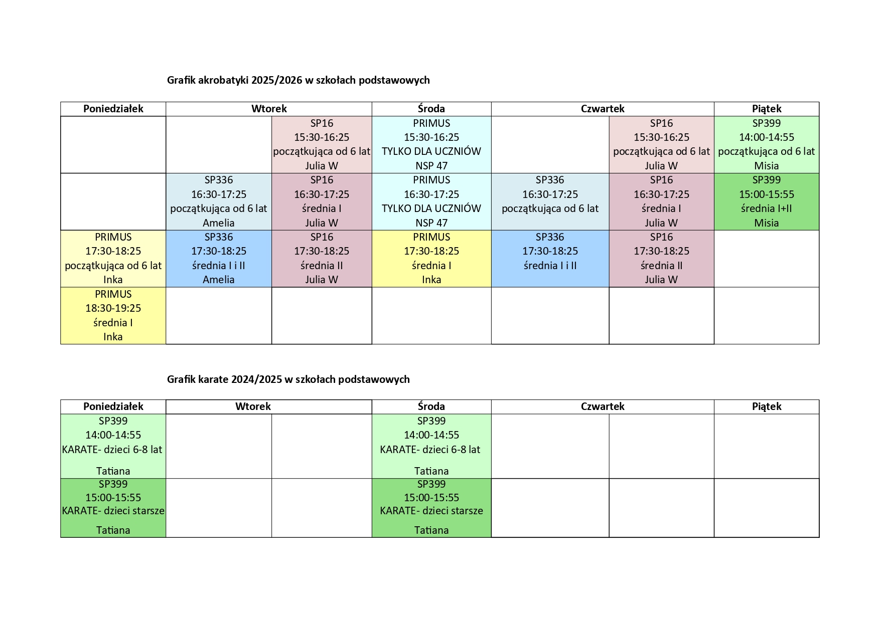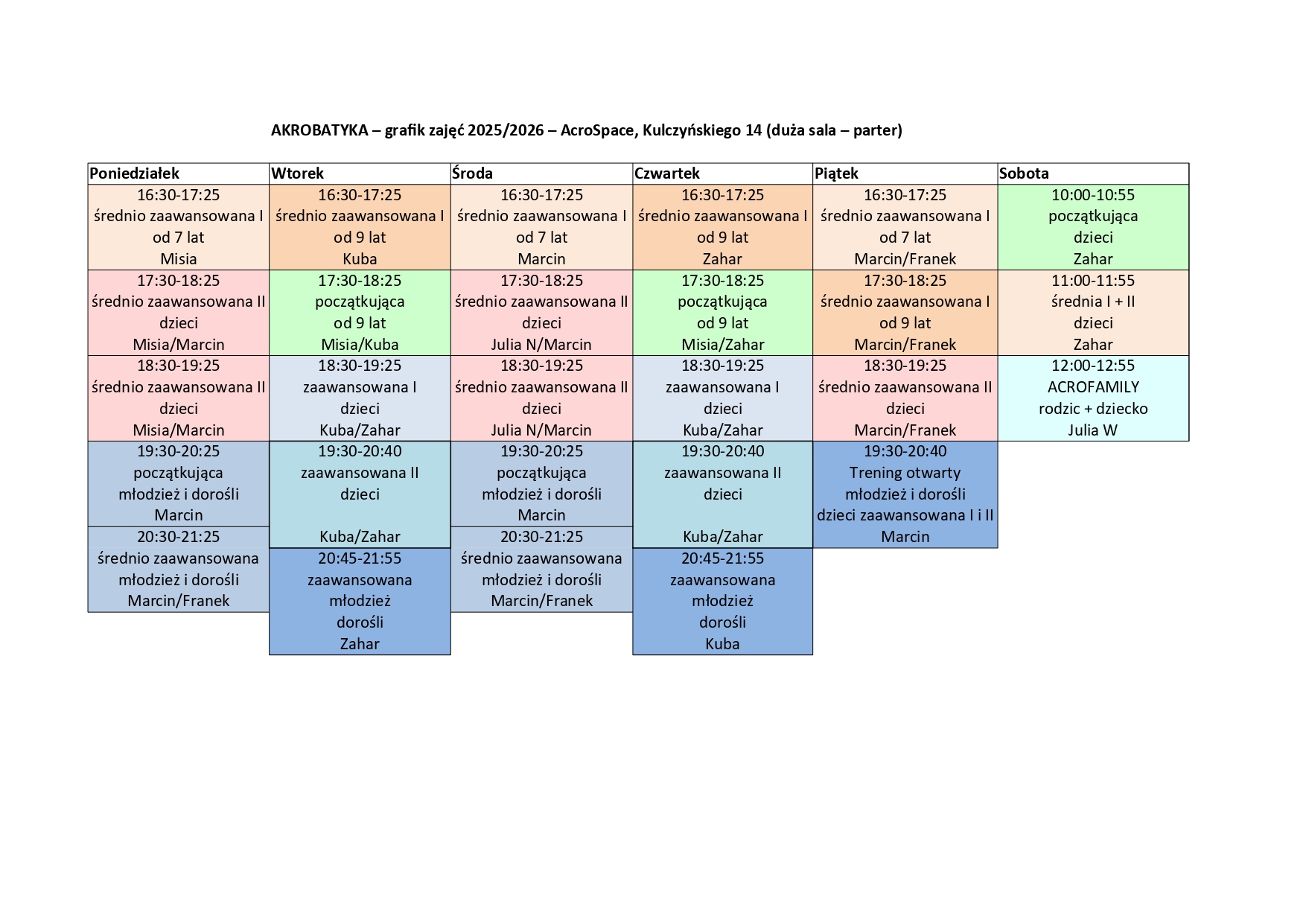 Grafik na sezon 2025/2026 Grafik obowiązuje od 01.09.2025. Grafik może ulec zmianie. Grafik AcroSpace Mała sala (I piętro) Grafik AcroSpace Duża sala (parter) Grafik Szkoły SP16, SP336, SP399, PRIMUS Grafik na wakacje Na zajęcia wakacyjne obowiązują zapisy. Grafik obowiązuje od 28.06.2025. Grafik może ulec zmianie. Zapisz się tutaj! Grafik AcroSpace Duża sala (parter) Zapisz się tutaj!